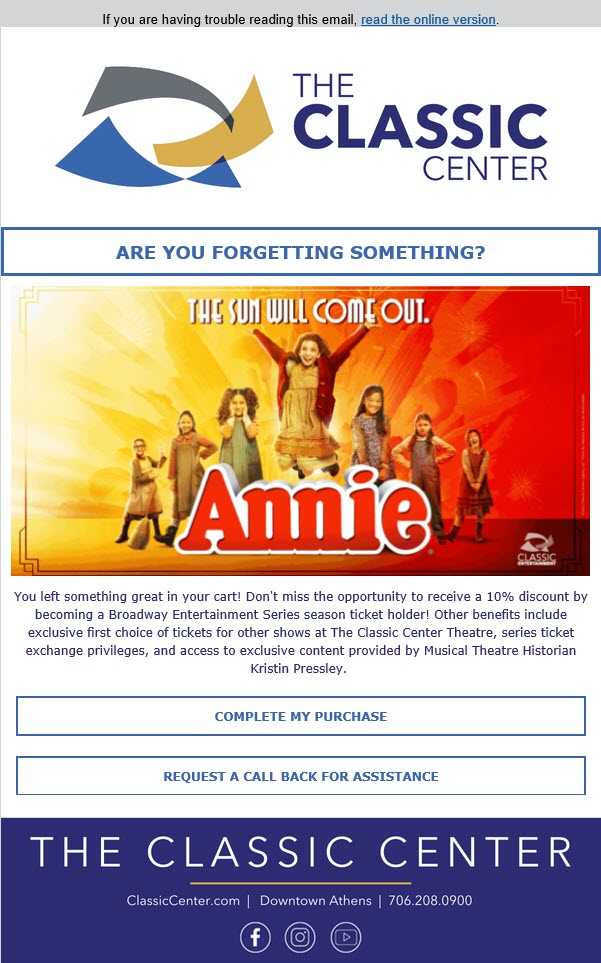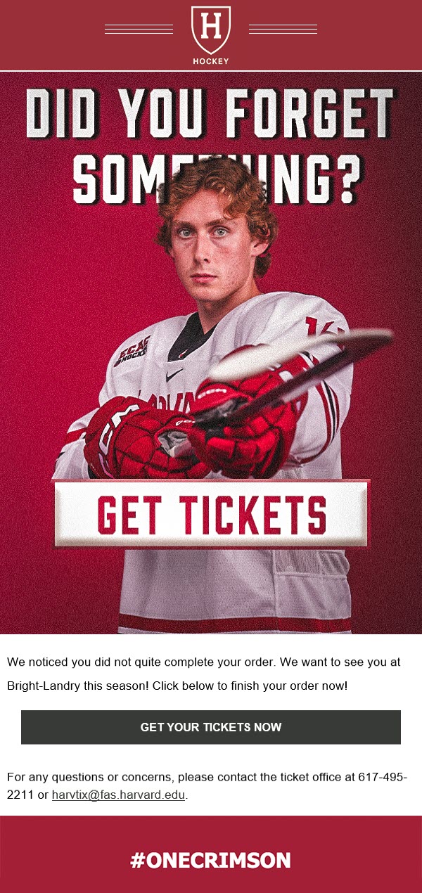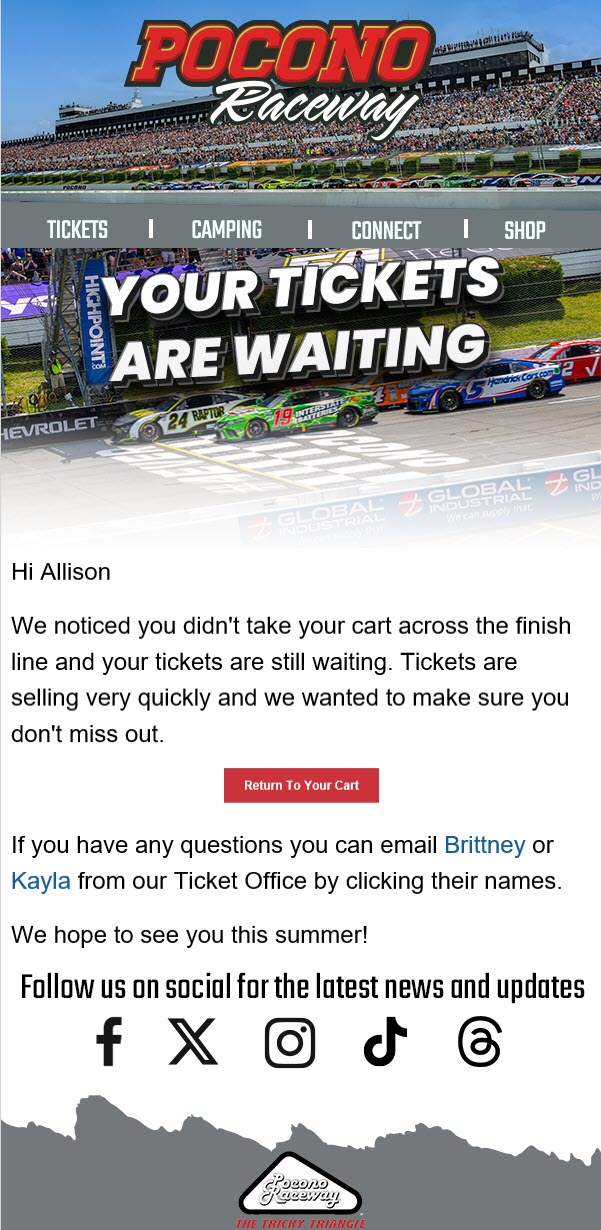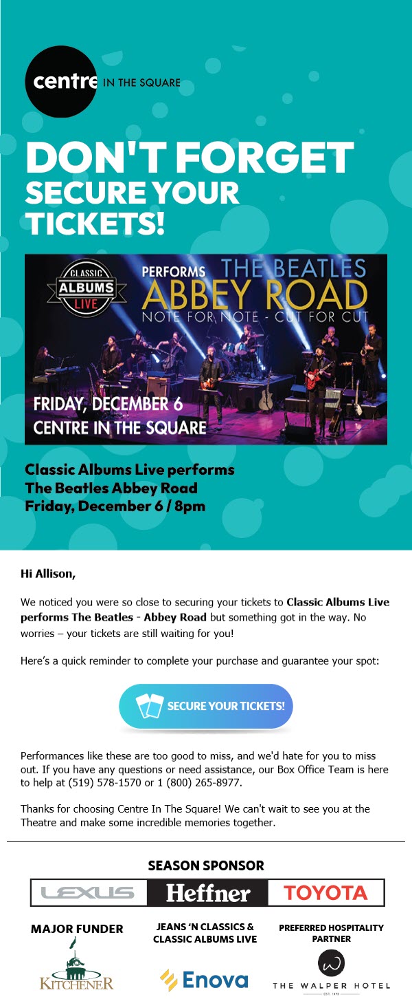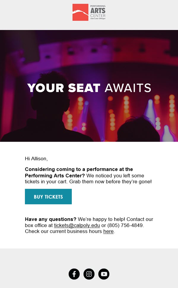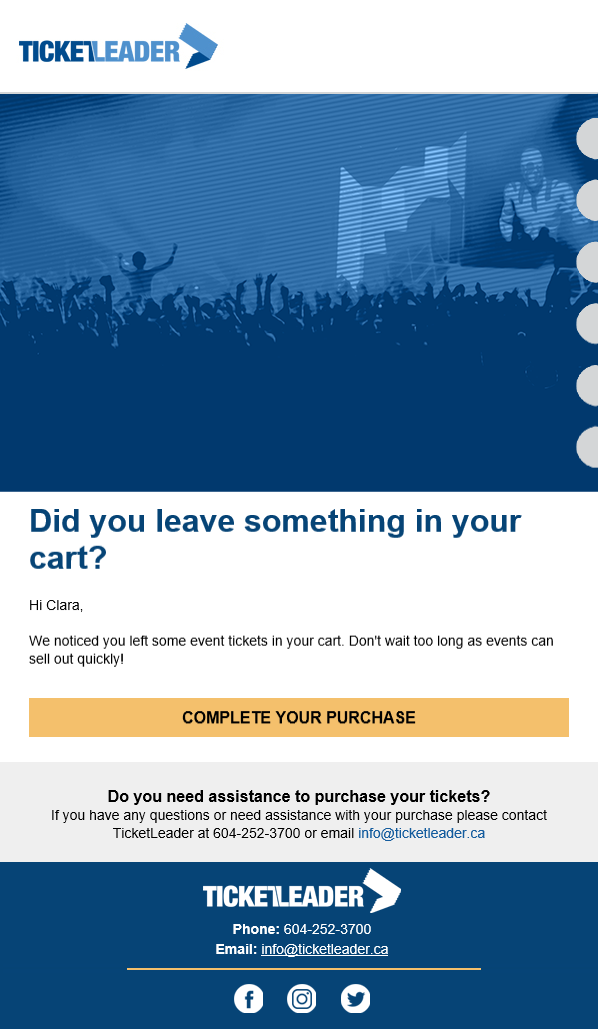 Reminder: Tickets are not stored in the cart once someone closes their session - this is to prevent people from holding inventory in their cart and blocking other customers from purchasing those seating locations. We recommend using language that encourages patrons to buy tickets or lock in their seats for the event but does not explicitly say to return to their cart.
