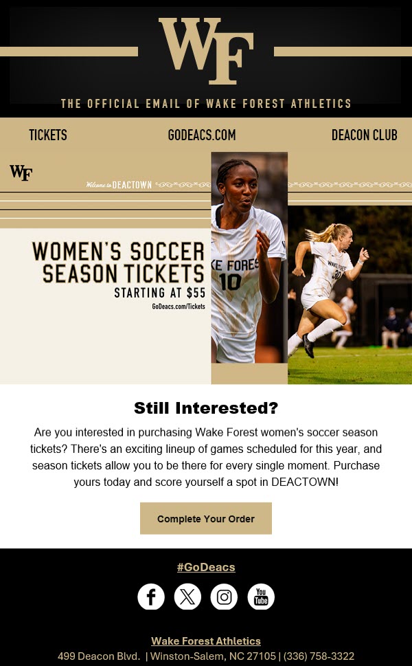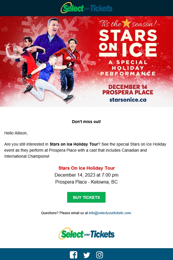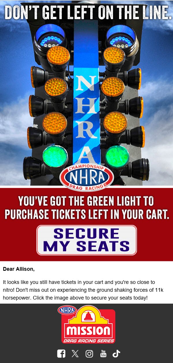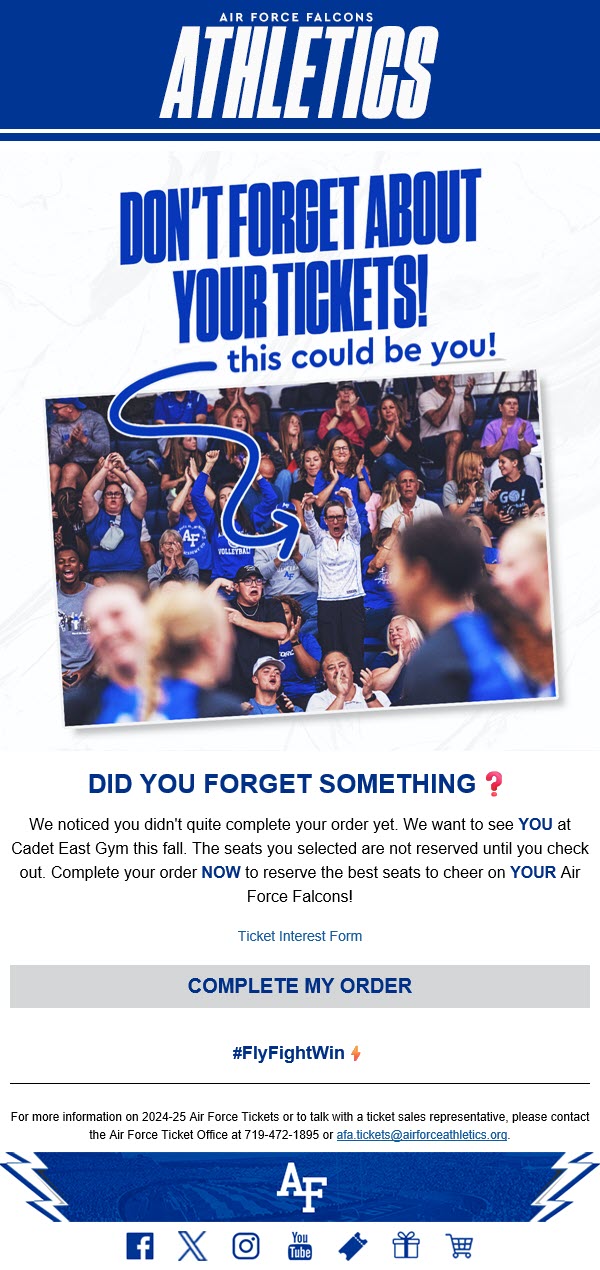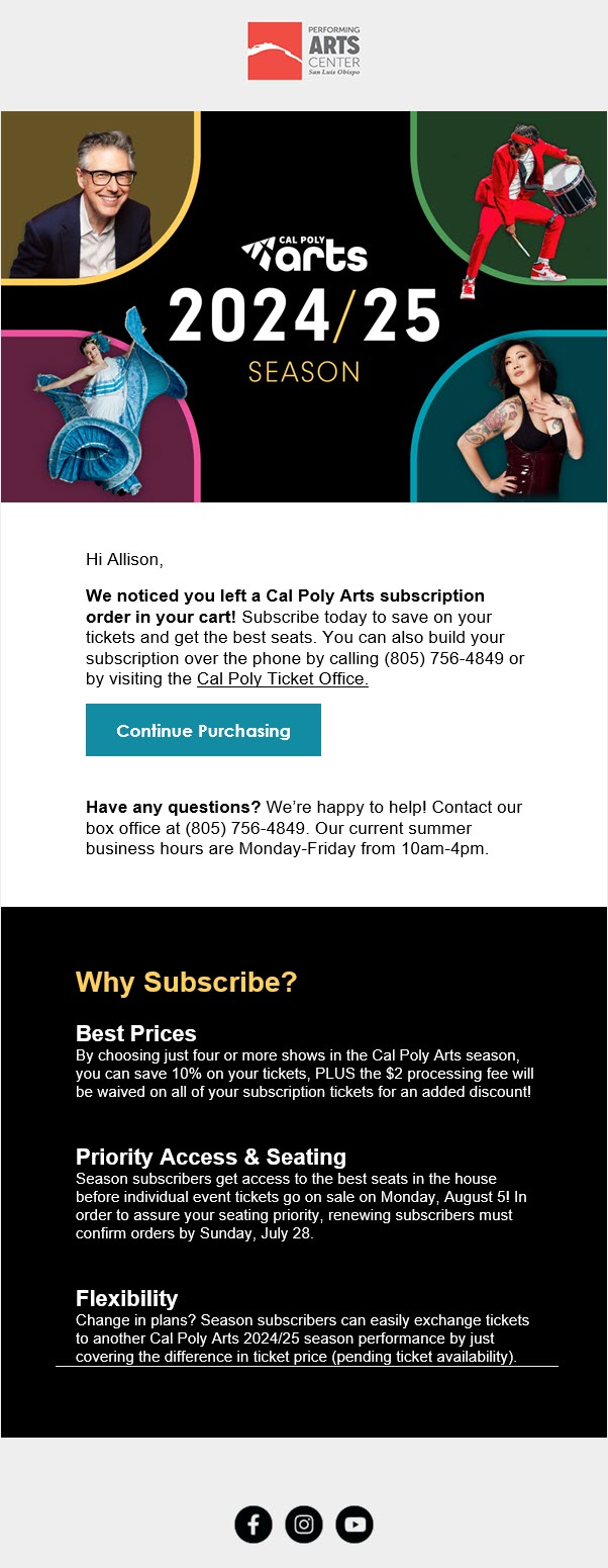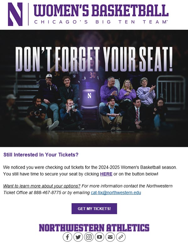 Reminder: Tickets are not stored in the cart once someone closes their session - this is to prevent people from holding inventory in their cart and blocking other customers from purchasing those seating locations. We recommend using language that encourages patrons to buy tickets or lock in their seats for the event but does not explicitly say to return to their cart.